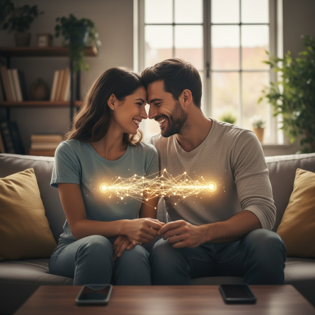 Descriptive alt text: Couple smiling together, phones set aside after successful digital communication, symbolizing real relationship connection.