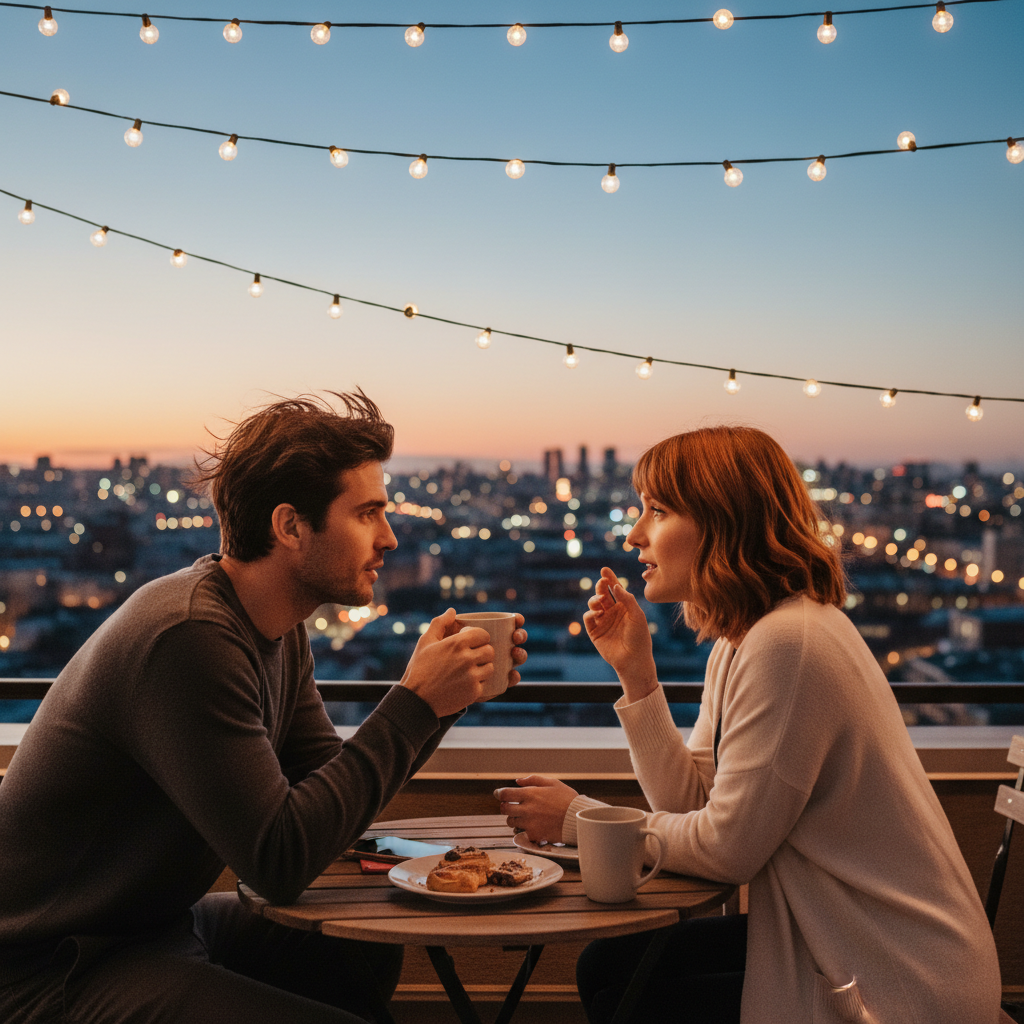 Image: Cinematic shot of a couple mid-argument, city lights outside a window. Alt: Couple in heated discussion at night, city backdrop, open communication relationship.