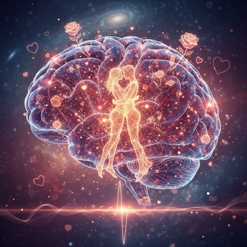 Alt text: Brain scan with neural activity patterns associated with attraction and romance.