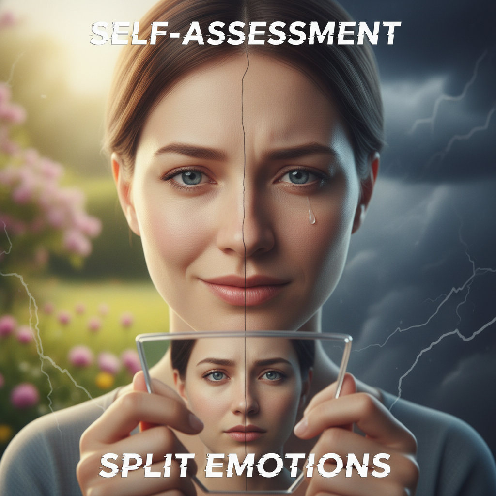 Alt text: Person doing self-assessment for relationship needs, looking into a mirror with split emotions.