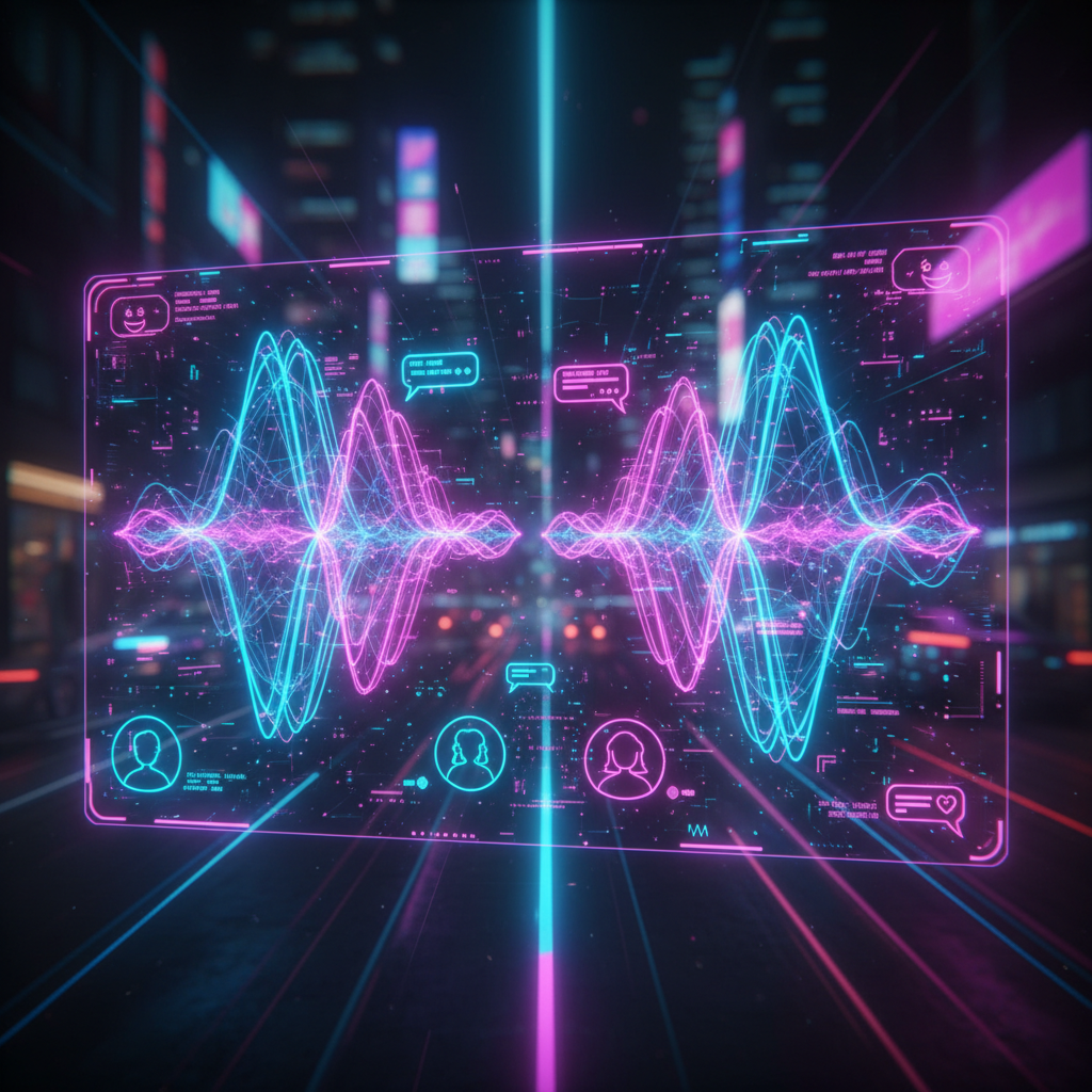 Alt text: AI interface in neon colors analyzing couple’s chat for relationship dynamics and personalized advice.