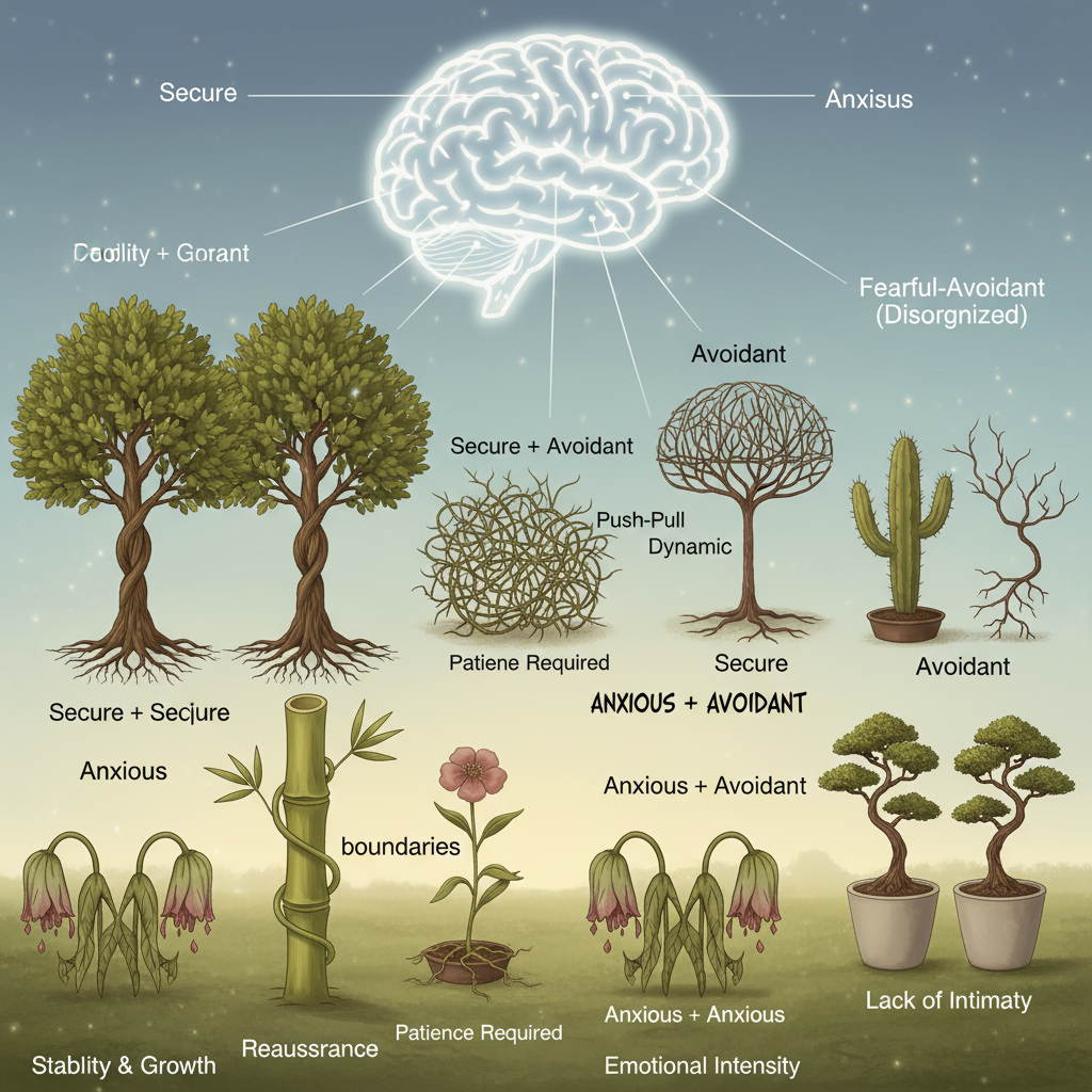 Marked by craving closeness but fearing abandonment. Anxious types often require extra reassurance and may interpret neutral events as threats, leading to emotional rollercoasters.