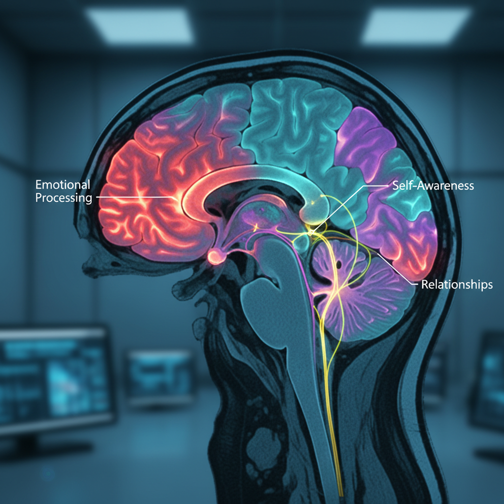 Science isn’t shy about love—it wants to know what lights up in our brains when we reflect on our relationships. Neuroimaging studies reveal that regions like the prefrontal cortex (responsible for planning and self-reflection), the anterior cingulate (empathy and emotional regulation), and the insula (internal emotional awareness) are all active when we practice relationship self-awareness.